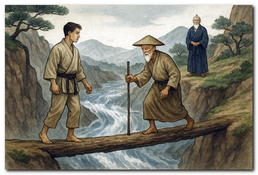 Il maestro invitò l'allievo a passare sullo stretto ed improvvisato ponte, certamente più grande della sottile linea su cui aveva l'abitudine di camminare nel Dojo. Il giovane allievo preso dall'incertezza indugiava.